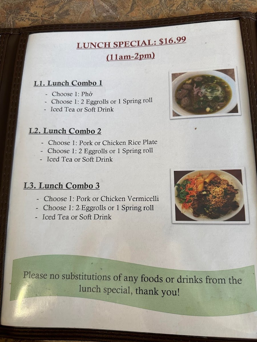 The menu features an impressive selection of rice plates, including the tender Grilled Pork and the rich Shaking Beef, each priced reasonably from $13.99 to $16.99. During lunch hours, indulge in creative combos that pair Pho with delicious appetizers and refreshing iced teas for just $16.99.